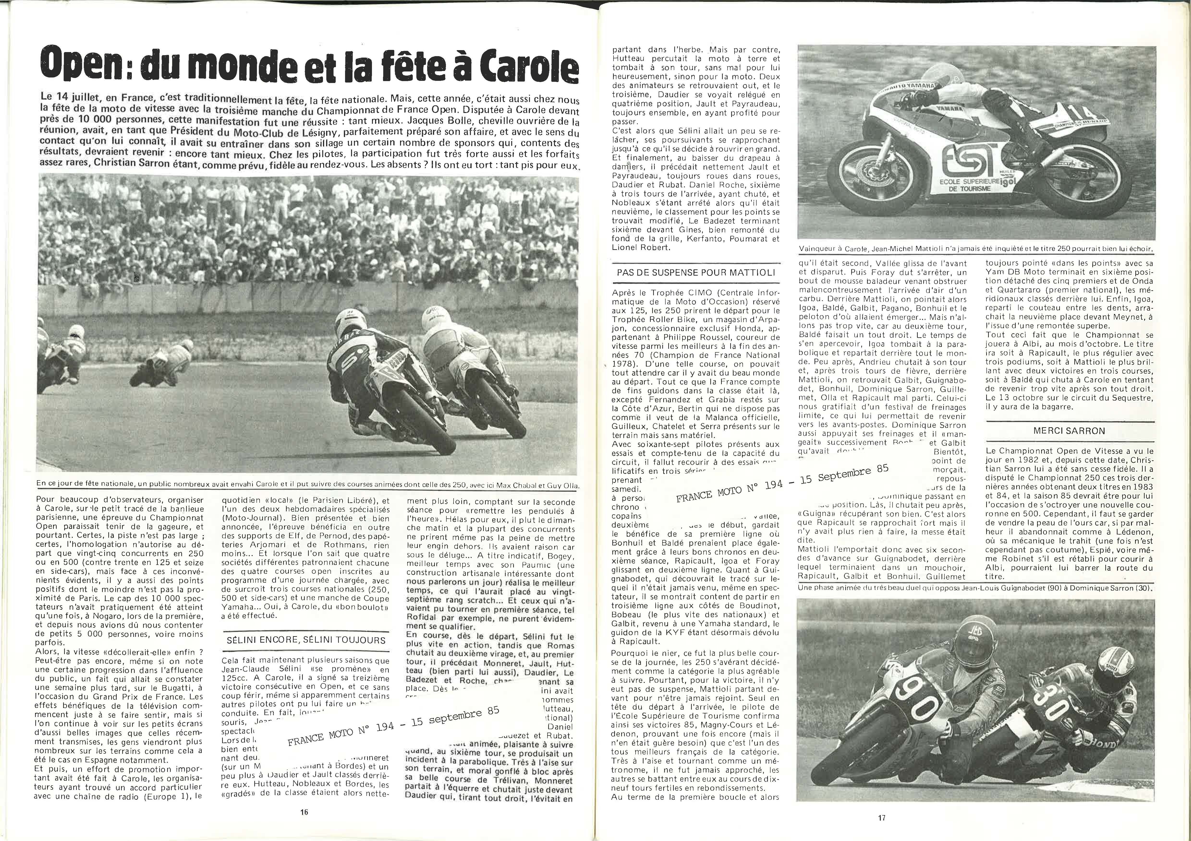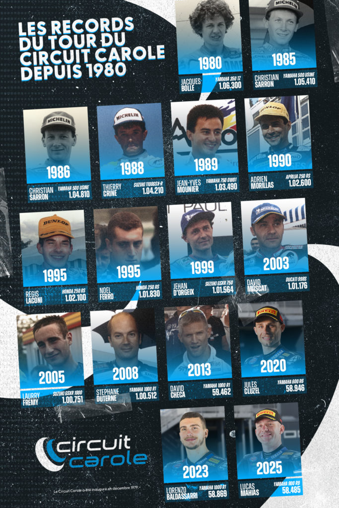 1979-2019, 40 ans de passion motocyclisteInitialement pensé comme une installation provisoire, le circuit est toujours très utilisé depuis plus de quarante ans. C’est depuis 2012 que la Fédération Française de Motocyclisme est chargée de sa gestion.2012 marque une nouvelle étape dans la vie du circuit Carole avec l’avènement de la Fédération Française de Motocyclisme à la tête de sa gestion…Alors que la décennie 1970 voyait, malheureusement, les chiffres d’accidents mortels à moto monter en flèche, de nombreuses courses « sauvages » se déroulaient avec des motards à la recherche de sensations sportives et d’adrénaline. La place de la Bastille et son quartier, et surtout les Halles du grand marché de Rungis étaient alors le théâtre de ces affrontements nocturnes non sécurisés. Malheureusement de nombreux jeunes trouvèrent la mort lors de ces événements (on évoque le chiffre de 18 morts à Rungis).Ces évènements ont été, entre autres, à l’origine de la création de mouvement de motards et notamment celui de la FFMC. Après de nombreuses manifestations sur le boulevard périphérique, bloquant tous les vendredis soir la circulation francilienne, le gouvernement français décida de prendre cette problématique à bras-le-corps pour répondre aux attentes de la population de motards souhaitant un cadre sécurisé pour remplacer Rungis.Dans le souci de leur proposer un cadre sécuritaire décent et sous l’impulsion des nombreux motards d’Ile-de-France et de figures telle qu’Yves Mourousi, le gouvernement français décide dès 1978 de la construction d’un circuit réservé aux motos proche de Paris. L’objectif est de proposer un espace réservé à l’entrainement des motards dans un espace destiné à la pratique et respectant toutes les normes de sécurité.L’année suivante, il sera alors décidé d’implanter cette structure dans la banlieue nord de la capitale. En effet, la municipalité de Tremblay-les-Gonesse (devenue depuis Tremblay-en-France) accepte d’abriter le projet. Novateur et simple d’accès, la piste du « circuit Carole » sera inaugurée le 1er décembre 1979. Ce nom de baptême sera alors un hommage à la dernière victime de Rungis, Carole Le Fol, qui se tua en moto en arrivant au Circuit de Rungis.Le circuit à travers le temps…Les années 80 Load More Championnat de France Open 1988 Load More Les années 90 Load More Les années 2000 Load More Les années 2010 Load More Articles de presseChampionnat de France Open 85, 86, 87 ,88 et 89 Load More Records du tour Inauguré fin 1979, le premier recordman référencé sur le circuit fut Jacques BOLLE (ancien Président de la FFM) qui en mai 1980 réalisa un chrono de 1’06’’30 au guidon d’une 350 Yamaha TZ. Ce record a tenu jusqu’en 1985. Cette année-là fut organisé pour la première fois, un championnat de France Open (FSBK aujourd’hui) à Carole. On trouvait au départ Christian SARRON sur sa 500 cc d’usine (équivalent d’une MOTO GP actuelle) qui réalisa à l’époque le chrono de 1’05’’41. Depuis le record du tour a été battu à de nombreuses reprises.Le titulaire actuel est Lucas MAHIAS, qui réalisa le 23 juin 2025 un chrono de 58″485.